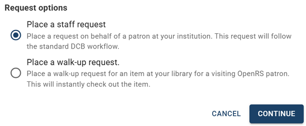 1. Make sure “Place a staff request” is selected and click CONTINUE